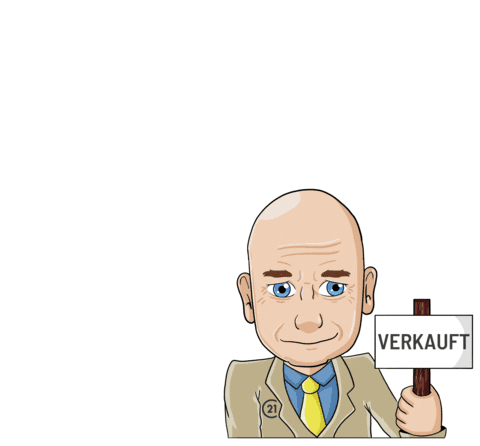 The Century21President, a bald cartoon man, celebrates a 'VERKAUFT' (SOLD) deal with a burst of confetti.