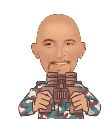 Um homem careca com barba, vestindo uma camisa camuflada, olha através de binóculos com um leve sorriso.