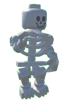 a skeleton made out of lego bricks is standing on its hind legs and flexing its muscles .