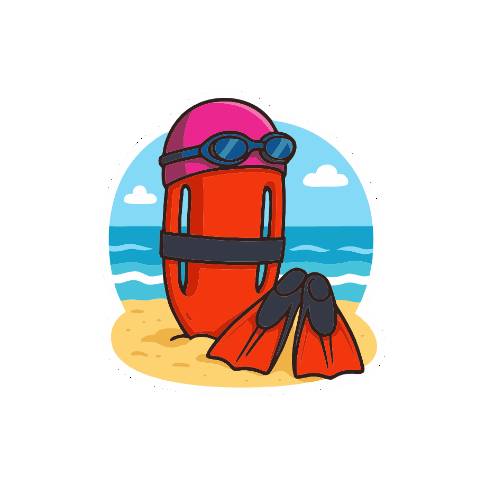a life preserver with goggles and flippers is sitting on the beach