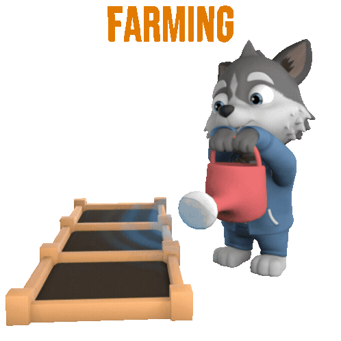 A cute cartoon husky waters a garden of growing coin plants, illustrating the concept of 'FARMING' in crypto.
