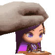 A cute chibi Caitlyn Arcane from League of Legends gets a gentle pet and a stylish hat placed on her head.