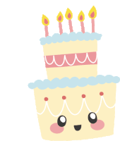 A charming two-tiered birthday cake with five lit candles and a cute, smiling face on the bottom tier, perfect for celebrations.