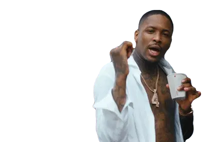 Rapper YG in a stylish black tuxedo jacket and pants, striking a cool pose with his hand near his mouth.