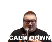 Celticcorpse, a man with glasses and a mohawk, tells viewers to calm down while holding a microphone.