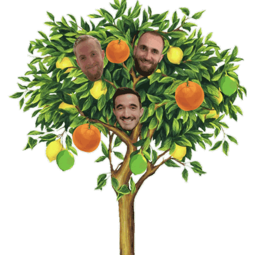 A fun animated sticker featuring The Camarades' faces on a spinning citrus tree, surrounded by vibrant leaves, oranges, and lemons.
