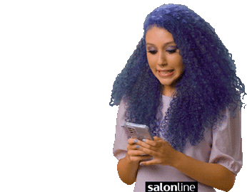 Camily Barros, with vibrant blue curly hair, smiles and reacts happily while looking at her phone.