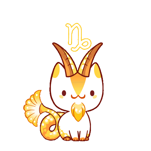An adorable animated Capricorn zodiac cat, with goat horns and a fish tail, playfully sits, stands, and falls.