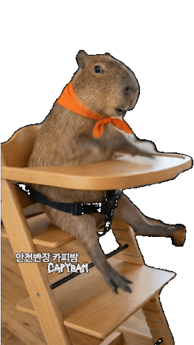 a capybara wearing an orange bandana sits in a wooden high chair