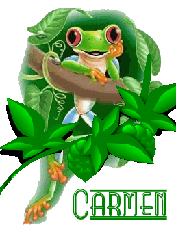 Carmen, a cute red-eyed frog, sits on a branch amidst lush green leaves, perfect for a charming message.