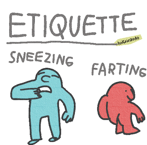 Luis Ricardo's cartoon illustrates etiquette for sneezing and farting, featuring a blue character sneezing and a red one farting.