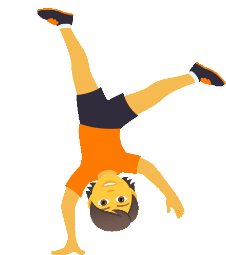 a boy in an orange shirt and black shorts is doing a handstand on a white background