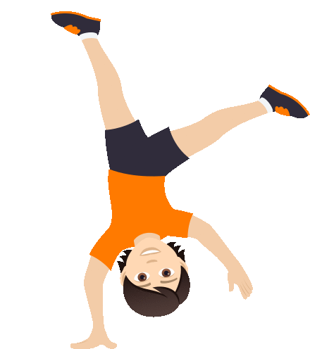a boy in an orange shirt is doing a handstand on a white background