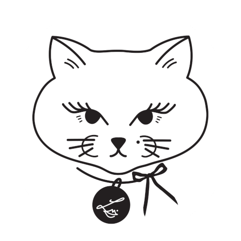 A charming black and white line art cat winks, featuring long eyelashes and a collar with an 'L' tag, by Lisa Eldridge.