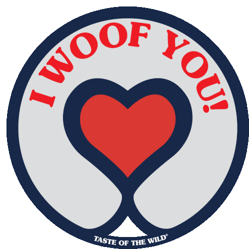Animated sticker from Taste of the Wild featuring 'I Woof You!' in a heart-shaped dog paw print, perfect for pet lovers.