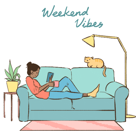 Embrace the 'Weekend Vibes' with this cozy sticker featuring a person reading on a sofa with a cat, enjoying coffee.