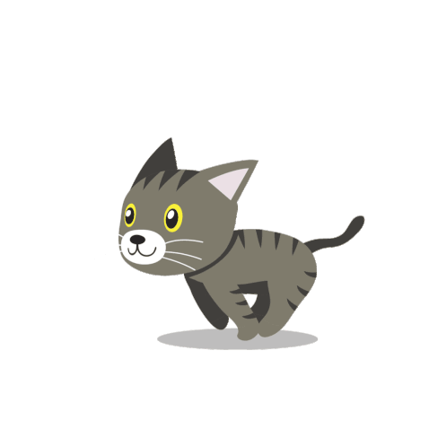 A cute cartoon grey tabby cat is animated running and playfully jumping on a white background.