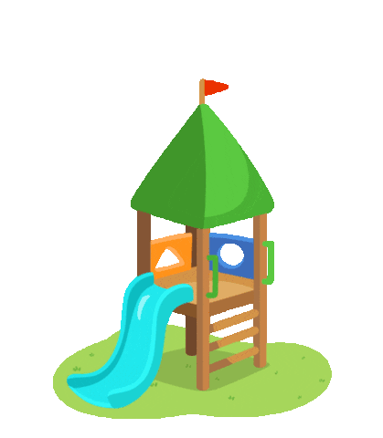 A cute grey cat-like character climbs a playground structure and slides down a blue slide with joy.
