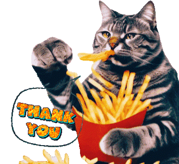 A funny tabby cat enthusiastically eats french fries from a red carton, with a 'Thank You' speech bubble appearing.