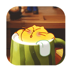 A cute, chubby yellow cat relaxing in a green watermelon-patterned tub, looking cozy and content.