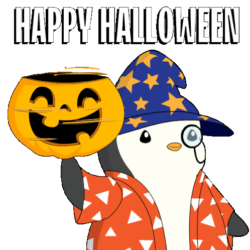 A pudgy penguin in a witch hat celebrates Halloween with a flying bat, pumpkin, and spooky grave.