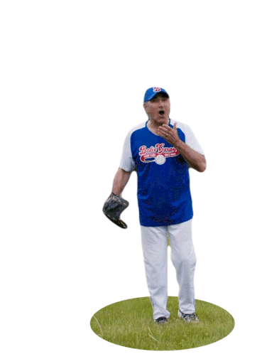 Johnny Rose from Schitt's Creek joyfully celebrates a victory, raising his arms in triumph with a baseball glove.