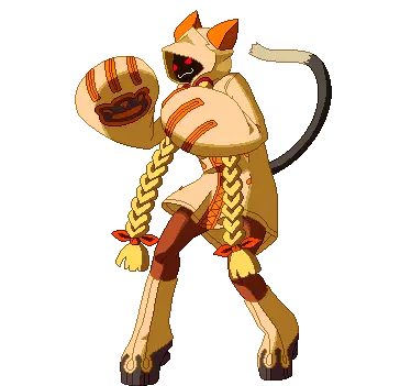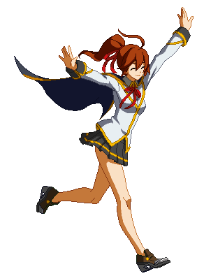 Celica Mercury from Blazblue, depicted in pixel art, happily posing in her school uniform with a cape.
