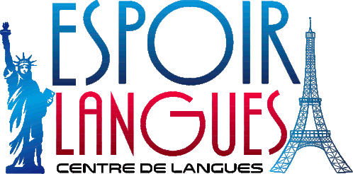 Logo for Espoir Langues, a language center, featuring the Statue of Liberty and Eiffel Tower.
