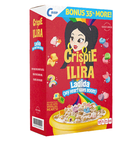 Animated cereal box featuring Crispie ILIRA and Ladida, with sparkling hearts and a 'My Heart Goes Boom' theme.
