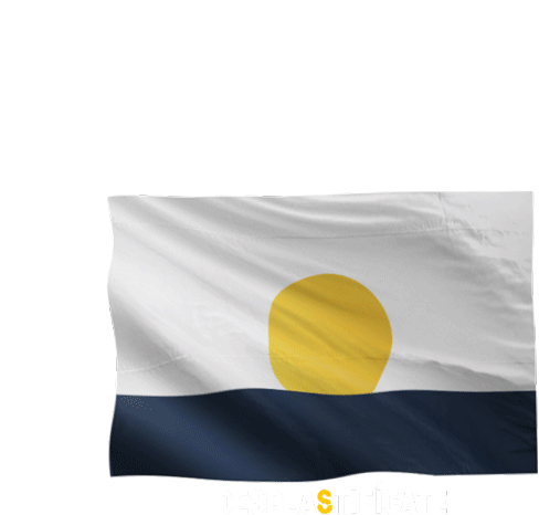 a white and blue flag with a yellow circle in the center