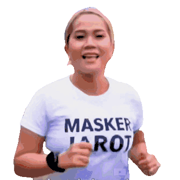 a woman wearing a white shirt that says masker laro