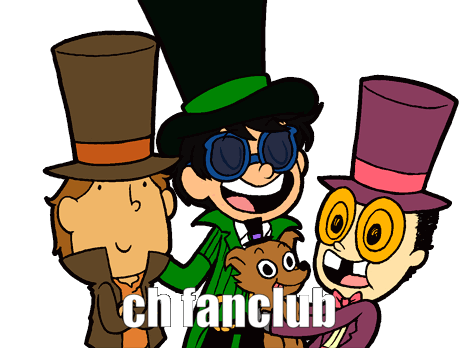 Three cartoon characters from the Ch Fanclub, including Layton, Onceler, and The Warden, wearing top hats.