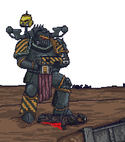 A pixel art Chaos Space Marine from Warhammer 40k, specifically an Iron Warrior, firing a bolter.