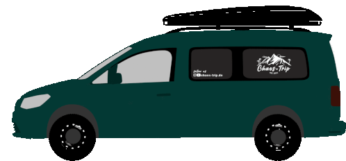 Animated sticker of a dark green Chaostrip Caddy camper van with a roof tent, perfect for van life adventures.