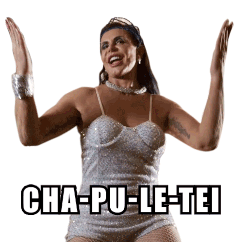 Brazilian icon Gretchen dances energetically in a sparkly silver outfit, with the Portuguese text 'CHA-PU-LE-TEI' displayed.