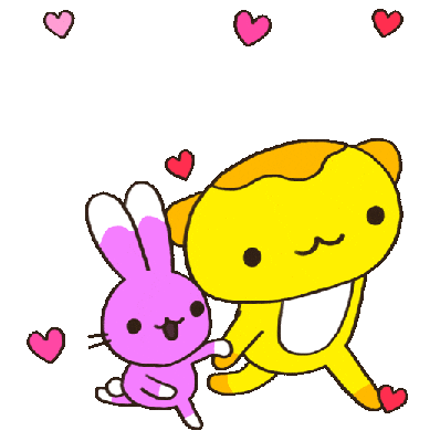 A cute pink bunny and a yellow bear, in a style reminiscent of Charlie Brown, walk hand-in-hand with hearts floating around them, symbolizing love and friendship.