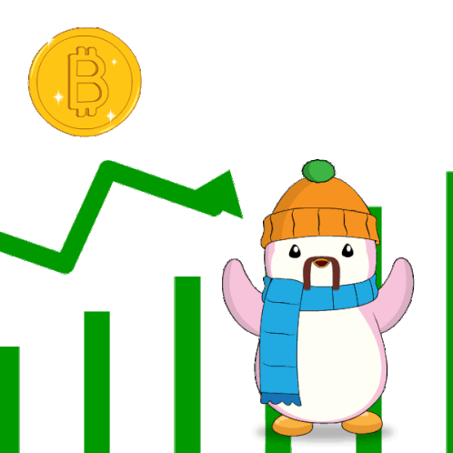 A Pudgy Penguin in a hat and scarf stands before a green upward chart, a Bitcoin coin, and a rising market.