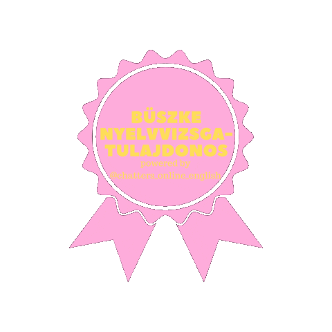 Pink ribbon sticker from Chattersonlineenglish, celebrating a proud language exam owner with Hungarian text.
