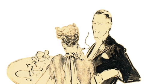 An animated drawing featuring Bryan Ferry, a man, and a woman chatting and smoking at a table.
