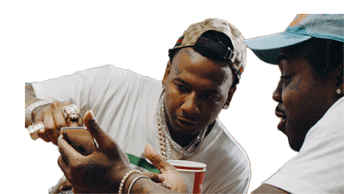 Moneybagg Yo shows something on his phone to Est Gee, who looks on intently, in a "Check This Out" moment.