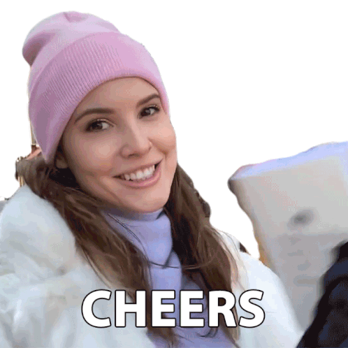Amanda Cerny, wearing a pink beanie and white jacket, smiles brightly and says 'CHEERS' in a joyful toast.