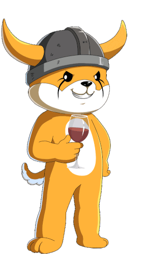 a cartoon dog wearing a viking helmet holds a glass of red wine
