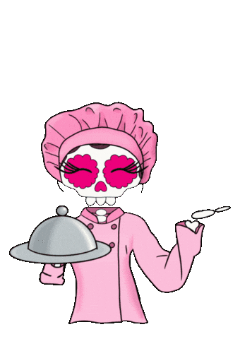 La Catrina Bohemia, a charming skeleton chef, presents a variety of delicious Mexican dishes with a flourish.