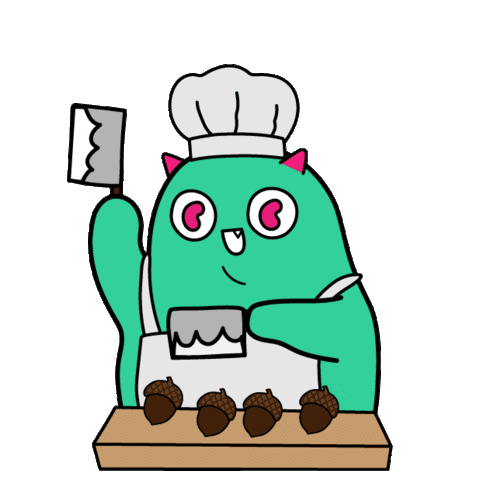 A cute green monster chef in a hat and apron chops ingredients, then happily holds a pile of them, with a squirrel friend on its head.