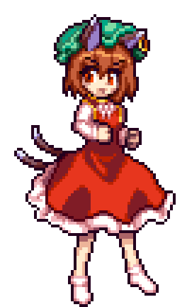 Chen Chen Yakumo, the pixel art character from Touhou Project, performs a lively dance.