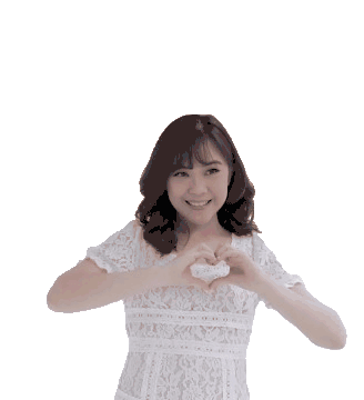 Cherrybelle Kici, a woman in a white lace dress, smiles sweetly while forming a heart shape with her hands.