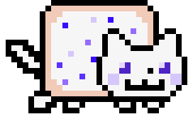 A pixel art Cheweycat with purple spots, flying like Nyan Cat with a rainbow trail.