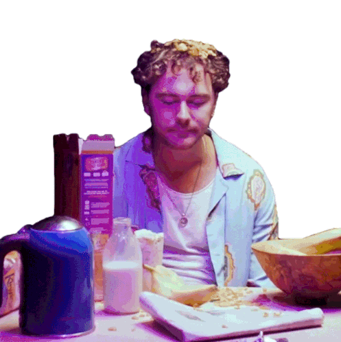 Cian Ducrot sits at a table, chewing with cereal on his head and scattered around him, surrounded by breakfast items.