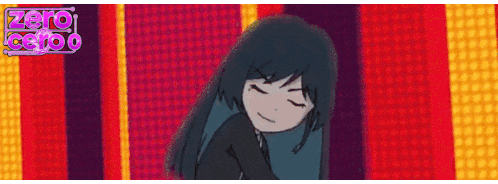 a cartoon girl with long black hair is smiling in front of a red and yellow background with the words zero cero written above her