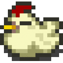 Animated pixel art chicken, reminiscent of Harvest Moon, with a red comb and yellow beak.